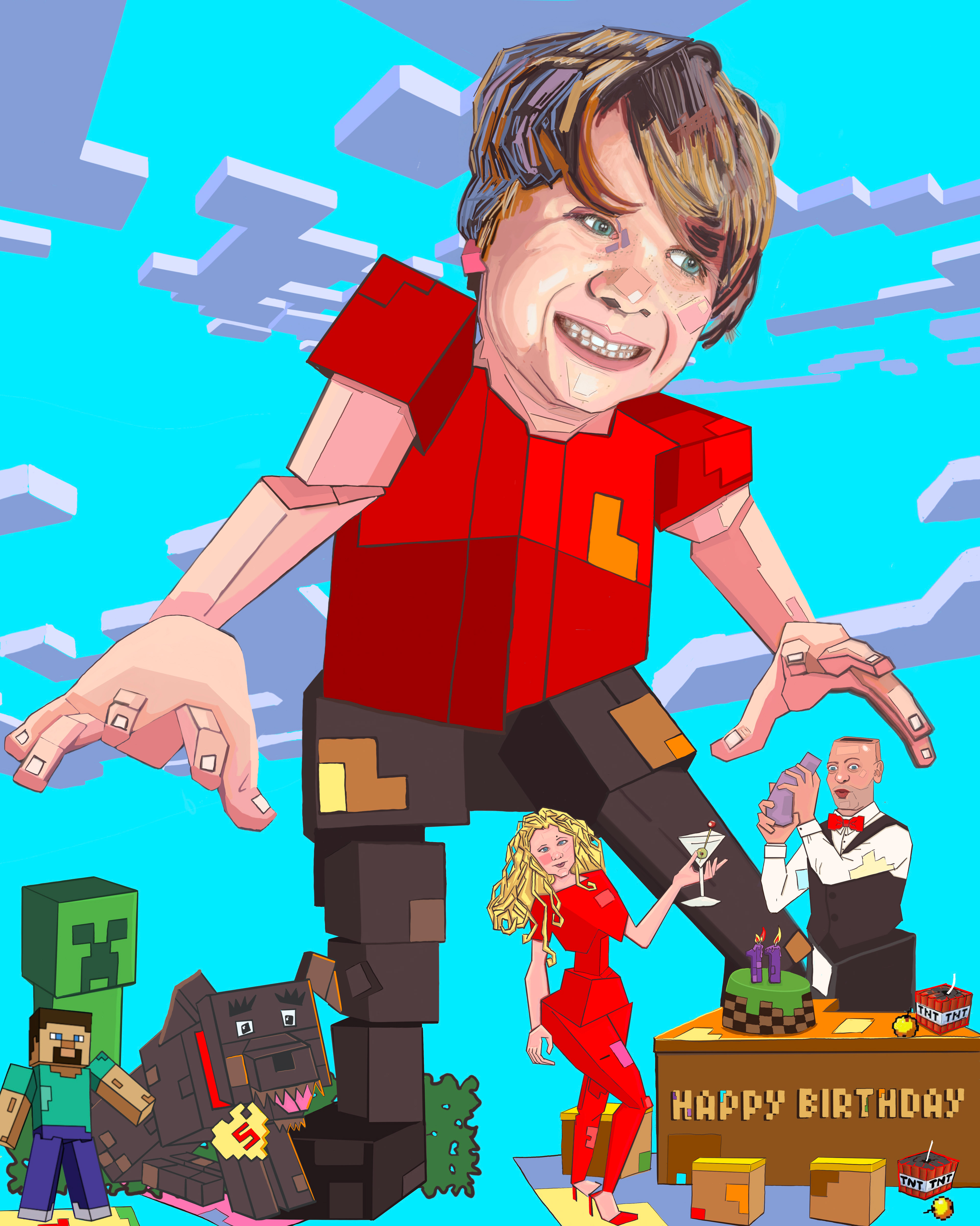 Developed as a birthday portrait, this piece translates a child’s interests and imagination into a narrative-driven visual scene. Familiar characters and environments serve as storytelling devices rather than literal references, allowing the portrait to merge likeness with fantasy. An11-year-old’s love of Minecraft, transforming the familiar digital world into a larger-than-life narrative where imagination, family, and play collide—featuring the child alongside his parents as part of the story.