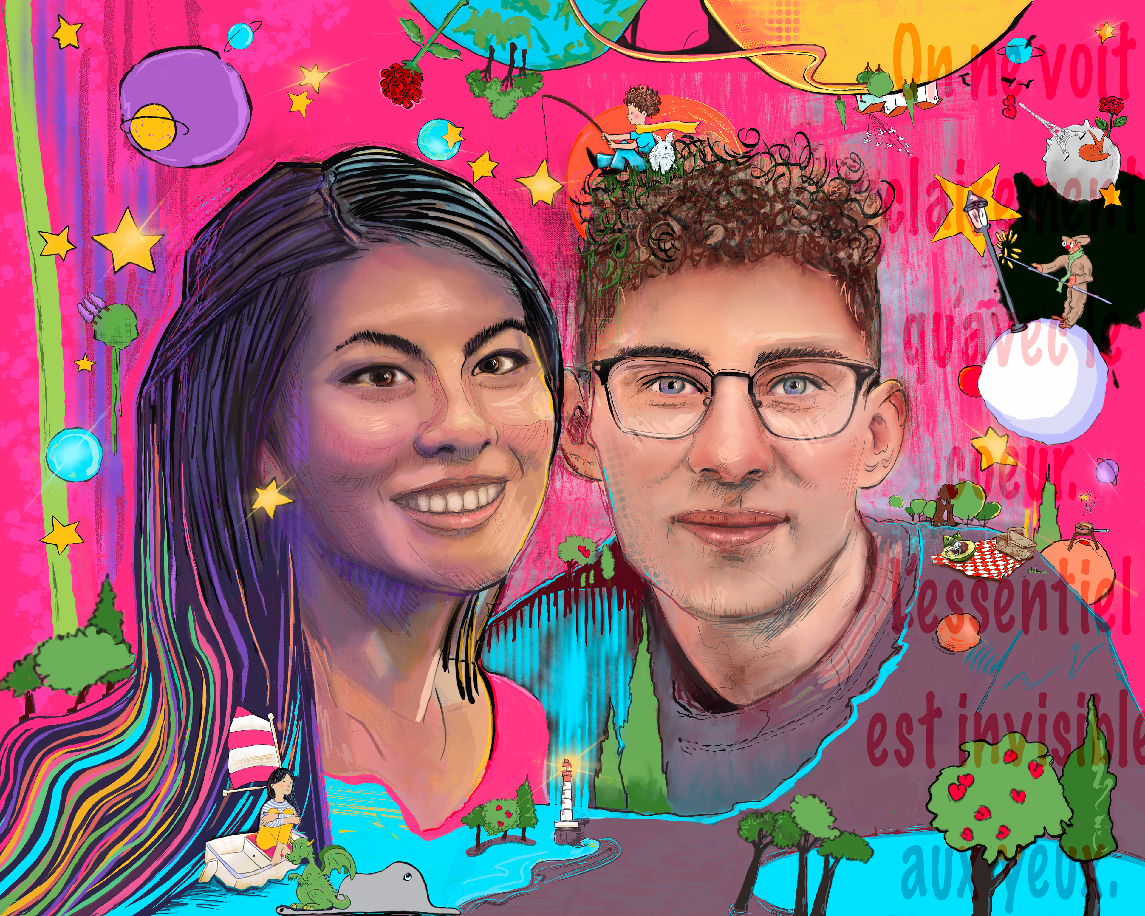 This couples portrait explores shared history and relationship dynamics through layered symbolism and expressive color. This custom portrait illustrates a couple’s shared journey, tracing the story of their relationship from early romance to engagement. Symbolic elements woven throughout the composition reflect meaningful places, memories, and inner worlds, transforming the portrait into a visual narrative rather than a literal likeness. Inspired in part by the timeless themes of The Little Prince—childlike wonder, imagination, and seeing with the heart—the vibrant color palette reinforces ideas of love, growth, and connection as an evolving story shaped by experience.Personal references and milestones inform the narrative content, while the overall composition, palette, and visual rhythm are artist-directed. The work functions as both a commemorative piece and a visual story—capturing connection, memory, and mutual identity within a cohesive illustrative framework.